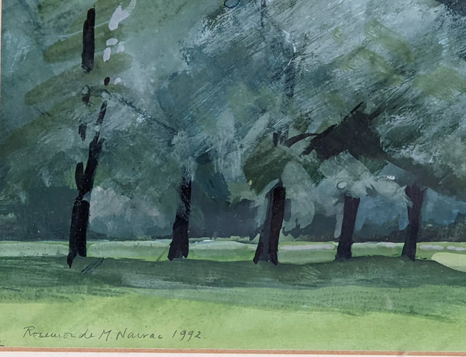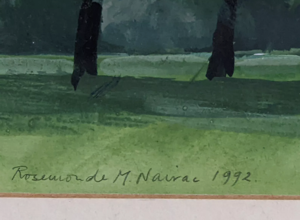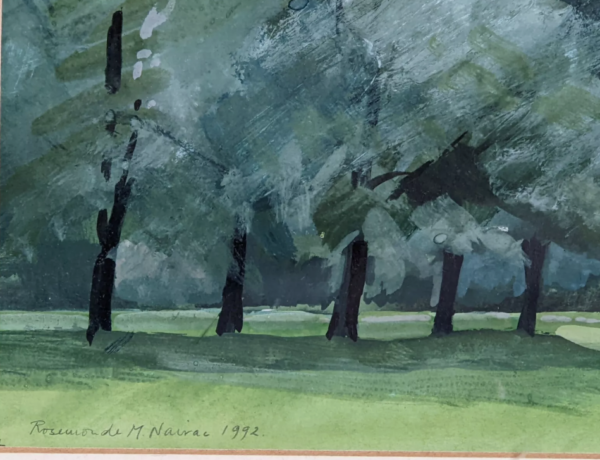 VERY GOOD CONDITION, internal dust on the glass, watercolor dated 1992, signed Rosemonde M. NAIRAC (1938 – ), decorator and designer in Great Britain, notably for Rosenthal porcelain, view of 16.5 cm x 20 cm, frame of 42 cm x 37 cm. See photos!!