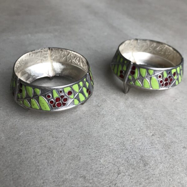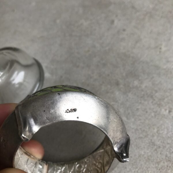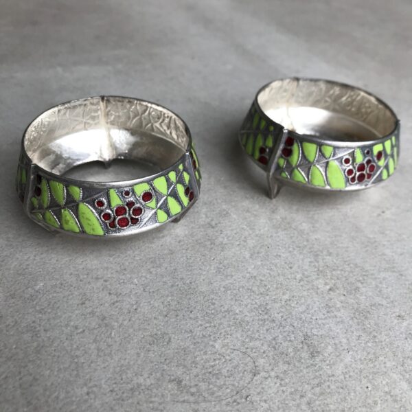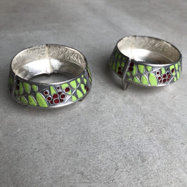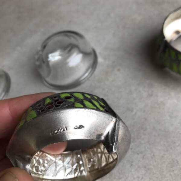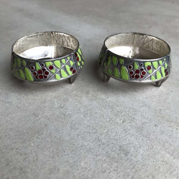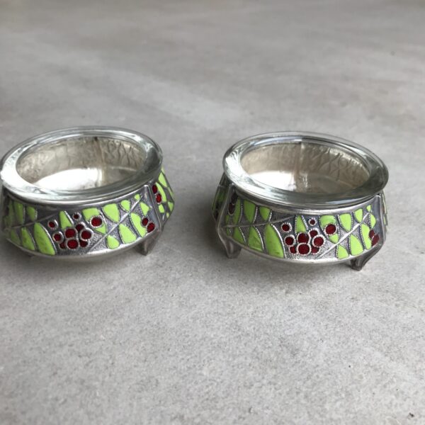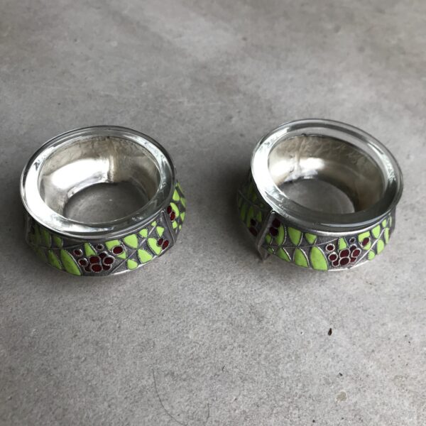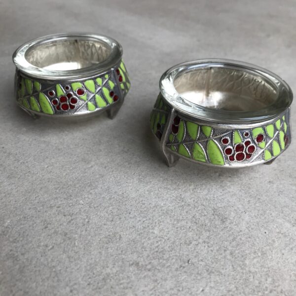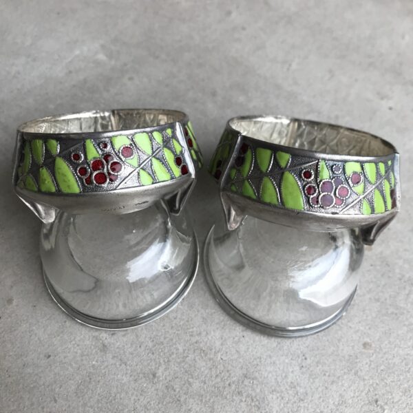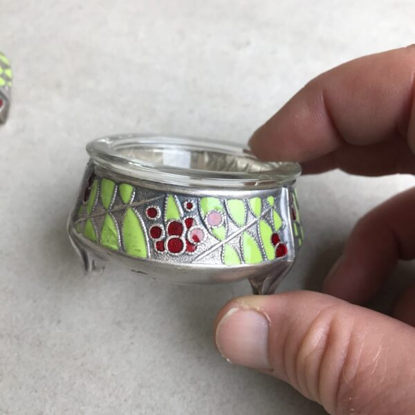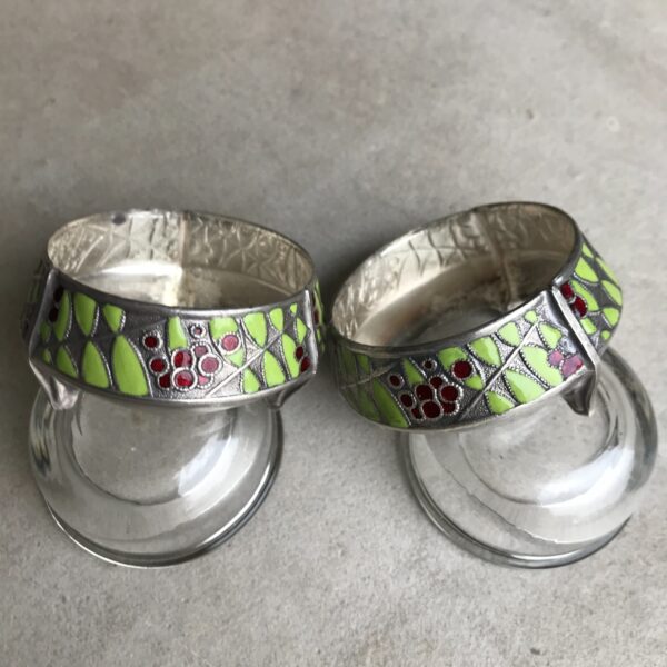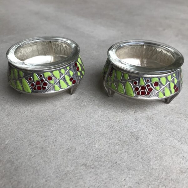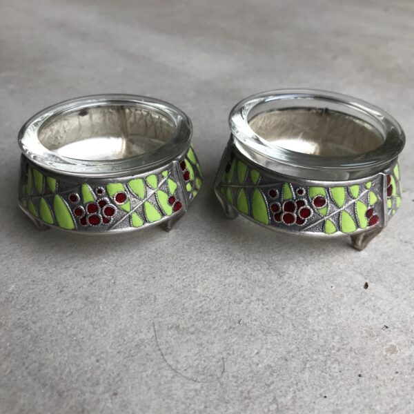 SALIERES ART DECO Métal argenté, signé, émaillé cloisonné