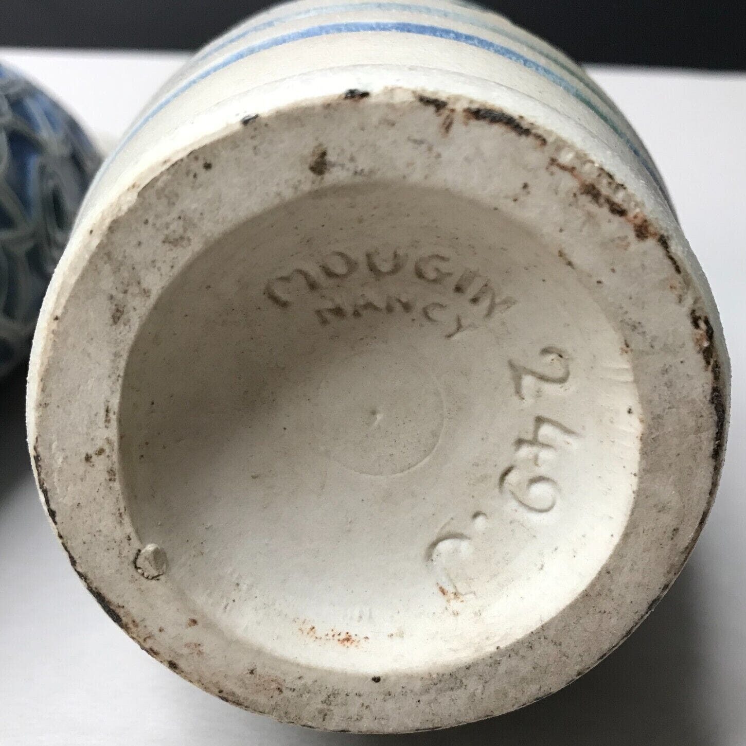 La signature en creux Mougin provient de la prestigieuse manufacture de Luneville qu’ils ont dirigé à partir de 1920. Les frères Joseph et Pierre Mougin ont marqué la céramique française art déco avec leurs vases en grès. Ils ont allié une production technique novatrice à leurs recherches artistiques. Leurs grès animaliers ont fait leur renommée.